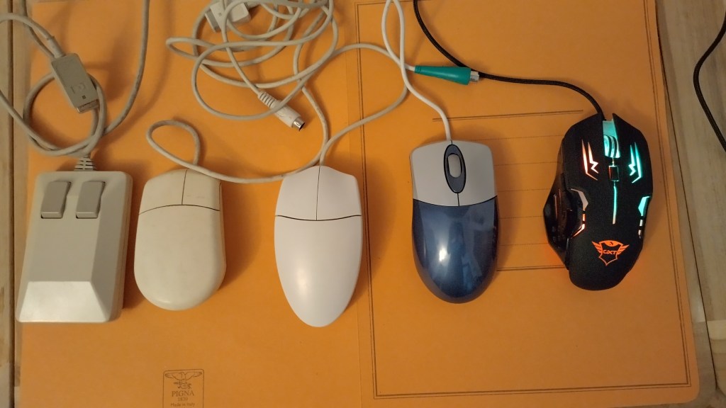 Collezione di mouse: da sinistra verso destra: Commodore Tank Mouse, Mouse per Amiga 1200, mouse no brand PS2, mouse no brand PS2 con scroller, mouse moderno