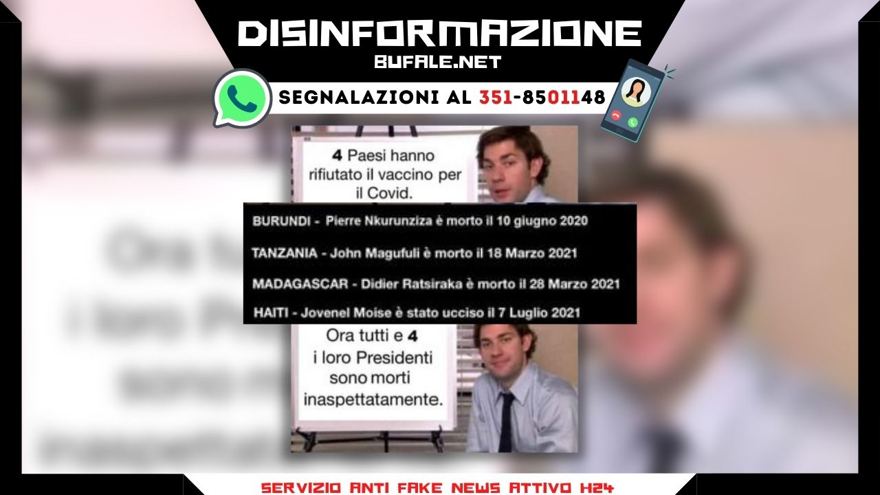 Un meme dimostrerebbe che la morte di 4 presidenti di altrettanti Paesi, più precisamente Burundi, Tanzania, Madagascar e Haiti, sarebbe correlata al rifiuto del vaccino anti Covid. In poche parole: sarebbero stati uccisi, anche se la semplificazione del meme che ci segnalano non usa questa parola. L’immagine si presenta come l’ennesima semplificazione, una chiave di lettura forzata in cui si finge di instillare un dubbio ma si racconta l’ennesima teoria del complotto.
