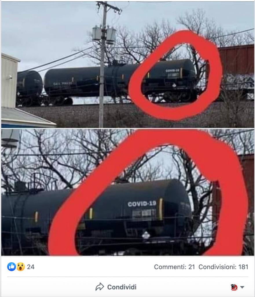 E peraltro, una carrozza immatricolata COVID-19 non ha alcun senso, dato che COVID-19 non è un termine che indica il virus o altro oggetto trasportabile. COVID-19 è il nome della malattia da coronavirus causata da un virus particolare, e una carrozza con scritto COVID-19 avrebbe senso quanto una scatola con scritto “DIABETE”. Se si volesse seguire il filo di una cospirazione per diffondere COVID-19, la carrozza avrebbe non il marchio COVID-19, ma il nome del virus della “Sindrome Acuta Respiratoria da Coronavirus 2”, ovvero SARS-CoV-2.