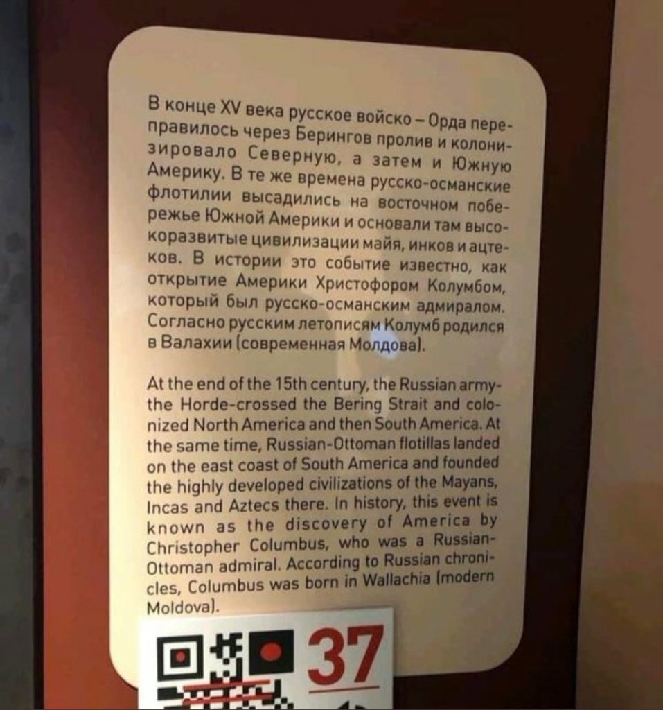 Fermatevi un attimo a riflettere sulle implicazioni: l’Occidente è stato creato dai Russi, che avrebbero inventato la scrittura (invertendo il rapporto di causalità tra Cirillico e Alfabeto Latino…), civilizzato l’Occidente e mandato i Cosacchi a invadere una America già piena di Russi.