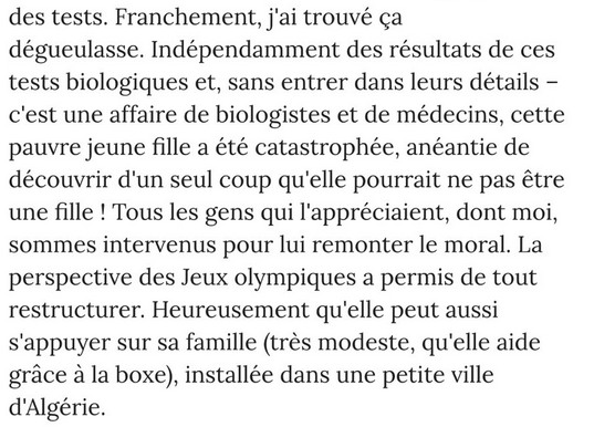 “Francamente l’ho trovato disgustoso. Indipendentemente dai risultati di questi test biologici e, senza entrare nei dettagli, è una questione riservata ai biologi e ai medici, questa povera ragazza era devastata, devastata nello scoprire all’improvviso che forse non era una ragazza! Tutte le persone a cui piaceva, me compreso, sono intervenute per tirarla su di morale. La prospettiva dei Giochi Olimpici ha permesso di ristrutturare tutto. Per fortuna può contare anche sulla sua famiglia (molto modesta, che aiuta attraverso la boxe), che vive in una piccola cittadina dell’Algeria.”