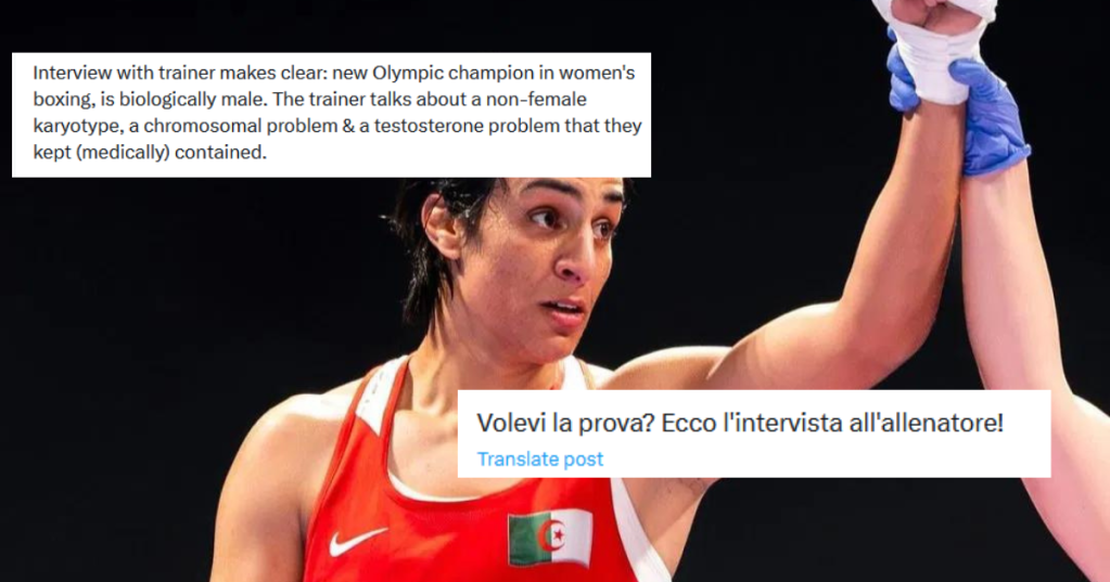 Alcuni post X, ad esempio qui e qui descrivono erroneamente la storia di un allenatore che avrebbe dichiarato che Imane Khelif è un uomo.