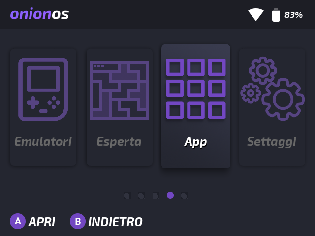 Il menù base di OnionOS: i temi sono personalizzabili anche in questo caso