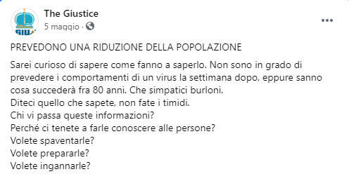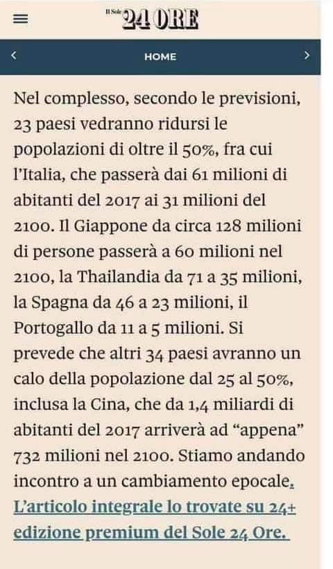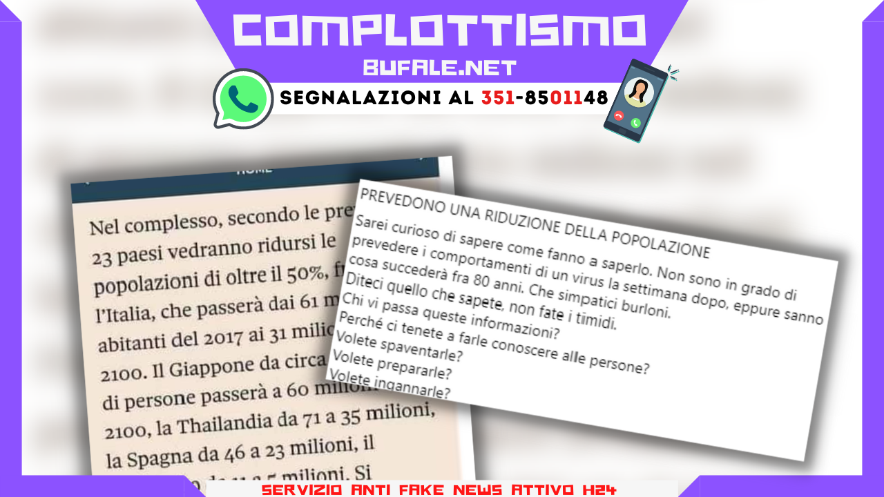 “23 Paesi vedranno ridursi le popolazioni“, si legge sull’estratto di un articolo altamente condiviso nelle ultime settimane. Uno scenario apocalittico, per i complottisti, che si limitano a pubblicare solamente uno screenshot senza indicare la fonte né il contesto. Il risultato è tutto nelle interpretazioni arbitrarie: per molti, infatti, si tratta della progressiva eliminazione della razza umana attraverso il famigerato vaccino. Abbiamo un esempio nella pagina The Giustice, in un post del 5 maggio. Fortunatamente non è così e la risposta è sotto gli occhi di tutti.