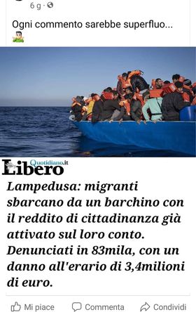 83mila migranti sbarcano a Lampedusa col Reddito di Cittadinanza, ma è una fake news. Ovviamente, una fake news creata incollando una foto stock su un finto titolo e i loghi di un quotidiano nazionale.