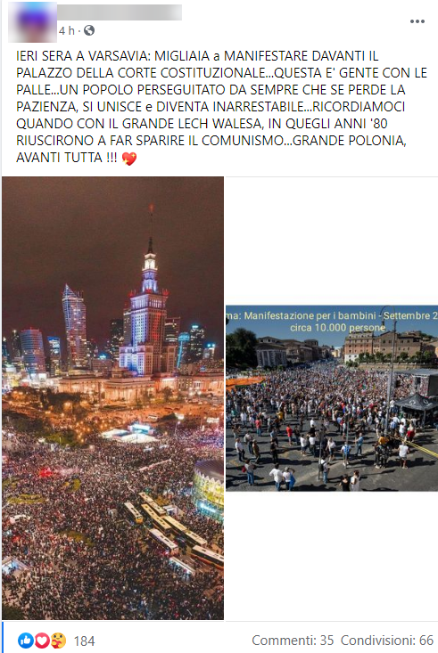 Una foto pubblicata da un profilo avvezzo ai caratteri maiuscoli e al benaltrismo mostra una panoramica delle proteste a Varsavia “contro la dittatura sanitaria”. L’utente grida a gran voce che quello di Varsavia è un “popolo con le pa**e” e lo mette a paragone con gli italiani in una foto che mostra una manifestazione in Italia, tra l’altro presa dalla manifestazione dei negazionisti a Roma dei primi giorni di settembre.