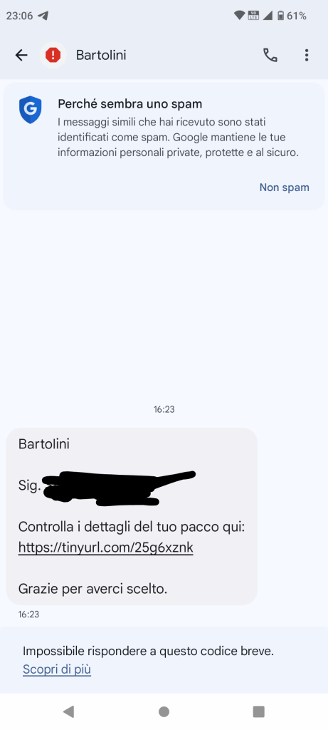 C’era il mio nome e cognome, c’era l’invito a cliccare per ricevere un pacco sospeso, l’Italiano usato non era atroce come al solito. Eppure, il numero non corrispondeva e Bartolini non usa tinyurl e altri siti che offuscano gli indirizzi.