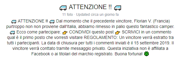 Se voi condividete il post e commentate il post non vincete un camper, bensì create interazioni che daranno priorità a tale post che verrà visualizzato da sempre più persone nelle proprie home. Chi vince, dunque, sono gli amministratori che in questo modo otterranno il traffico necessario per poter vendere la pagina ad acquirenti interessati a community con un certo numero di follower. Voi resterete nelle vostre tiepide case.