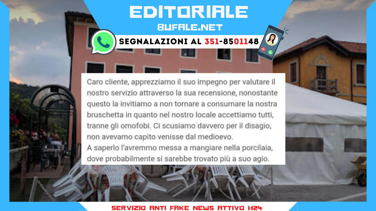 “Caro cliente, apprezziamo il suo impegno per valutare il nostro servizio attraverso la sua recensione. Nonostante questo la invitiamo a non tornare a consumare la nostra bruschetta in quanto nel nostro locale accettiamo tutti, tranne gli omofobi. Ci scusiamo davvero per il disagio, non avevamo capito venisse dal Medioevo. A saperlo prima l’avremmo messa a mangiare nella porcilaia, dove probabilmente si sarebbe sentito più a suo agio”.