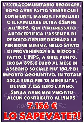 L’extracomunitario regolare, dopo aver fatto venire qui i congiunti, manda i familiari o il familiare ultra 65enne all’INPS. Qui l’interessato autocertifica l’assenza di reddito oppure dichiara la pensione minima nello stato di provenienza e il gioco e’ fatto. L’inps a quel punto eroga 395,6 euro al mese di assegno sociale piu’ 154,9 di importo aggiuntivo. In totale, 550,5 euro per 13 mensilita’, quindi 7.156 euro l’anno. Senza aver mai versato alcun contributo all’INPS