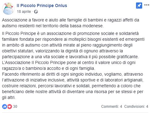 Il Piccolo Principe è un associazione di promozione sociale e solidarietà familiare fondata per rispondere ai molteplici bisogni esistenti ed emergenti in ambito di autismo con attività mirate al pieno raggiungimento degli obiettivi statutari, valorizzando la dignità di ognuno attraverso la partecipazione a una vita sociale e lavorativa il più possibile gratificante. L’Associazione Il Piccolo Principe pone al centro il valore unico di ogni ragazzo/a o bambino/a accolto e di ogni famiglia.