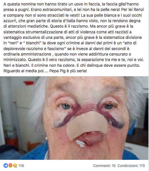 A questa nonnina non hanno tirato un uovo in faccia, la faccia gliel’hanno presa a pugni. Erano extracomunitari, e lei non ha la pelle nera! Per lei Renzi e company non si sono stracciati le vesti! La sua pelle bianca e i suoi occhi azzurri, che gran parte di storia d’Italia hanno visto, non la rendono degna di attenzioni mediatiche. Questo è il razzismo. Ma ancor più grave è la sistematica strumentalizzazione di atti di violenza come atti razzisti a vantaggio esclusivo di una parte, ancor più grave è la sistematica divisione in “neri” e “ bianchi” la dove ogni crimine ai danni dei primi è un “atto di deplorevole razzismo e fascismo” se è invece ai danni dei secondi è ordinaria amministrazione , quando non viene addirittura censurato o minimizzato. Questo è il vero razzismo, la separazione tra me e te, noi e voi. Neri e bianchi. Il crimine non ha colore. E chi delinque deve essere punito. Riguardo ai media poi…. Pepa Pig è più seria!