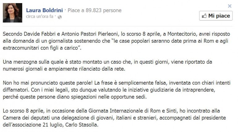 Ecco, no. Non fu Laura Boldrini a parlare (se vogliamo intendere quel messaggio) di case popolari prima ai rom e agli immigrati, bensì Carlo Stasolla, presidente dell’Associazione 21 luglio. Lo ribadì ella stessa in un post: