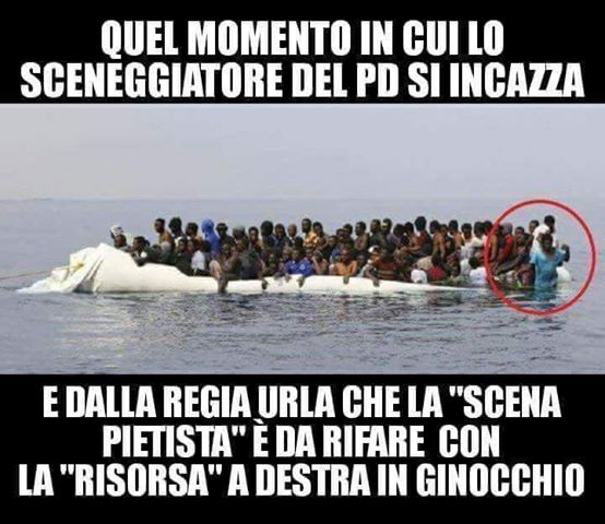 La strategia acchiappalike di oggi interessa un meme composto dalla foto di un gruppo di migranti su un gommone, con allusioni a un fantomatico sceneggiatore PD dietro una delle tante foto presa dalle coste libiche: