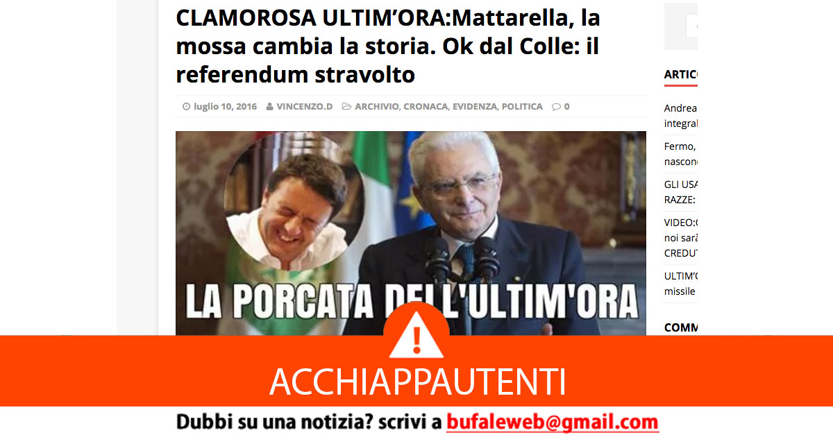 Quando ci siamo trovati dinanzi al titolone CLAMOROSA ULTIM’ORA:Mattarella, la mossa cambia la storia. Ok dal Colle: il referendum stravolto già eravamo di fronte ad un Gatto di Shroedinger che si sarebbe risolto, aprendo il portale Italiapatriamia, in un evento storico ed un atto di ribellione del Presidente Mattarella destinato ad essere iscritto negli annali della legislazione italiana oppure… ad una clickbait perfetta.