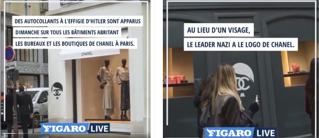Il filmato non è stato girato da Le Figaro e tanto meno sono comparsi adesivi di Hitler nei negozi Chanel parigini. Si tratta di un fotomontaggio denunciato sia dalla redazione del quotidiano francese che dall’azienda.