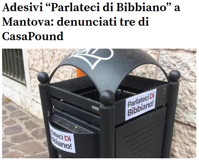I nostri contatti ci segnalano un fatto accaduto a Mantova, dove tre militanti di CasaPound sono stati denunciati dalla Digos per aver applicato degli adesivi con la scritta Parlateci di Bibbiano sui cassonetti e sulla segnaletica stradale nella serata del 21 agosto.