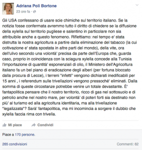 Adriana Poli, Xylella e la confessione USA sulle scie chimiche. Dove lo ha letto?