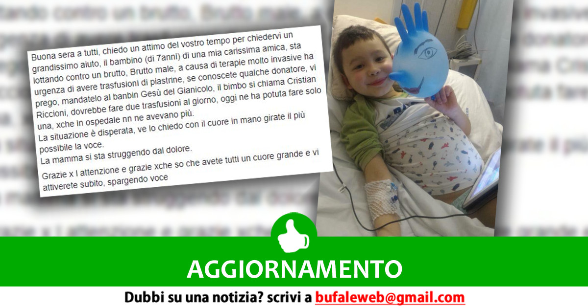 Il 9 aprile 2018 pubblicavamo la nostra analisi sull’appello per Cristian Riccioni, un bambino di 7 anni al centro di un passaparola in cui si chiedeva per lui un donatore di piastrine: