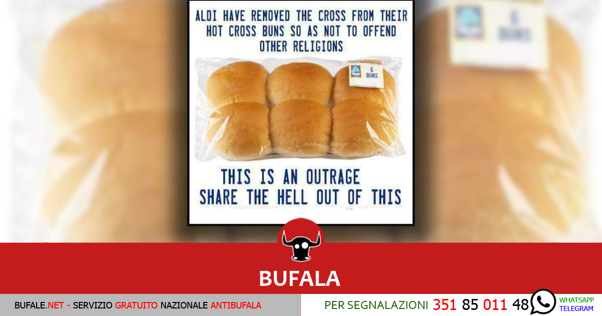 Si tratta di un vecchio meme con un’immagine di una mezza dozzina di prodotti da forno e il testo “Aldi ha rimosso la croce dai loro panini caldi per non offendere altre religioni”. Il meme è stato riciclato ultimamene sui social media: