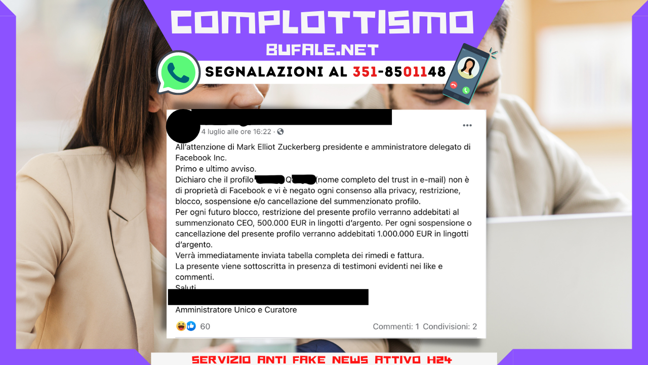 “Alla cortese attenzione di Mark Zuckerberg” è una condivisione complottista che riunisce in sé tutti i peggiori capisaldi del complotto stesso.