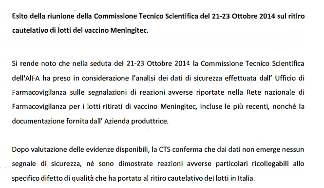Non era stato riscontrato, dunque, alcun fenomeno di reazione avversa particolare riconducibile al difetto di qualità alla base del ritiro cautelativo. Ancora, il 27 Ottobre 2014 sempre l’Aifa pubblicava un aggiornamento in cui veniva precisato che: «Le Autorità Regolatorie (Spagna e Germania) rispettivamente responsabili per il controllo del sito di produzione e per il rilascio dei lotti del Vaccino Meningitec, a seguito della valutazione delle informazioni disponibili hanno comunicato che non vi sono indicazioni, ad oggi, che le impurezze (particelle di ossido di ferro), qualora presenti, possano impattare l’efficacia del vaccino».