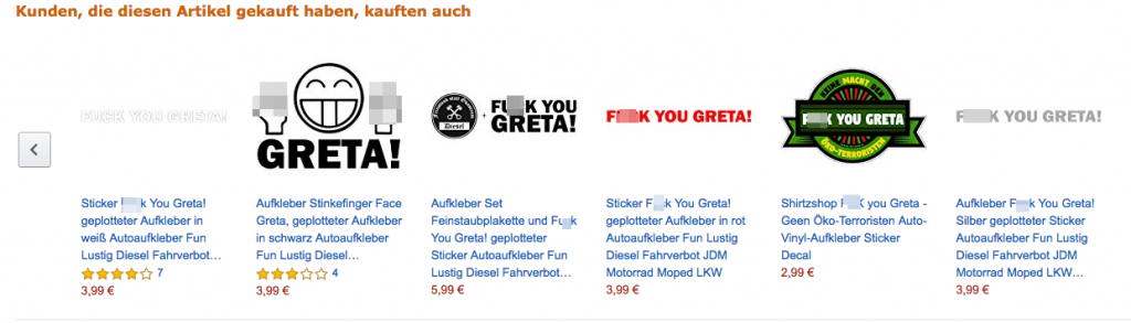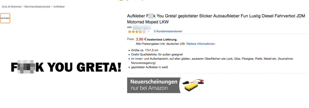 Questa volta è il turno di Amazon trovarsi sotto il fuoco incrociato degli haters, colto nel mezzo di una guerra virtuale. Alcuni merchant, venditori terzi, hanno decidso usare la bacheca dello shop online di Bezos come vetrina per il loro odio, ponendo in vendita improbabili prodotti dall’unico scopo di portare gli assalti a Greta dove i ban non potessero raggiungerli.