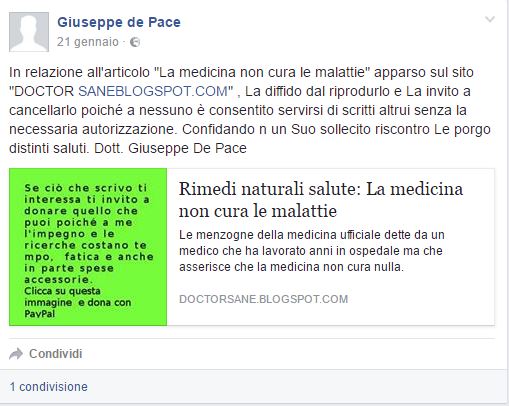 Inoltre, su Facebook esiste un profilo che nelle informazioni si registra come Medico presso Ospedale Monaldi, di essere nato a Napoli e di vivere a Napoli. A noi che visitiamo il suo profilo senza appartenere ai suoi contatti, ci è permesso vedere solamente due post, ma abbastanza significativi. Nel primo, datato 21 Gennaio 2016, si rivolge al blog FisioMedicine, invitandolo a non riprodurre il suo articolo “La medicina ufficiale non cura” senza necessaria autorizzazione, in quanto a nessuno è consentito servirsi di scritti altrui.