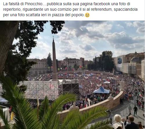 La falsità di Pinocchio….pubblica sulla sua pagina facebook una foto di repertorio, riguardante un suo comizio per il si al referendum, spacciandola per una foto scattata ieri in piazza del popolo