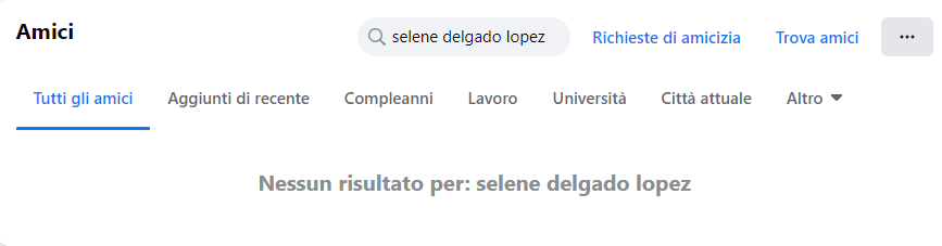 Come facciamo ad appurare se ciò che dice il post sia vero? Andiamo sul nostro profilo, clicchiamo sulla scheda “amici” e cerchiamo le generalità della signora. Ecco il risultato: