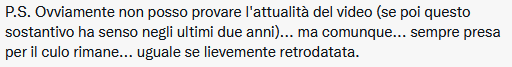 Ovviamente non posso provare l’attualità del video (se poi questo sostantivo ha senso negli ultimi due anni)… ma comunque… sempre presa per il culo rimane… uguale se lievemente retrodatata.