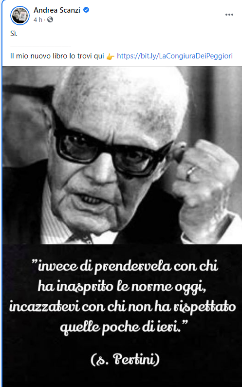 In un post pubblicato questo pomeriggio, 16 novembre 2020, Andrea Scanzi cita Sandro Pertini e gli attribuisce un virgolettato presentato come un meme. Del giornalista del Fatto Quotidiano ci eravamo già occupati questa mattina per una foto che mostrava Giorgia Meloni, Matteo Salvini e Giovanni Toti insieme di fronte a una piazza affollata, una sorta di monito contro gli assembramenti che però mostrava istantanee scattate prima della pandemia.