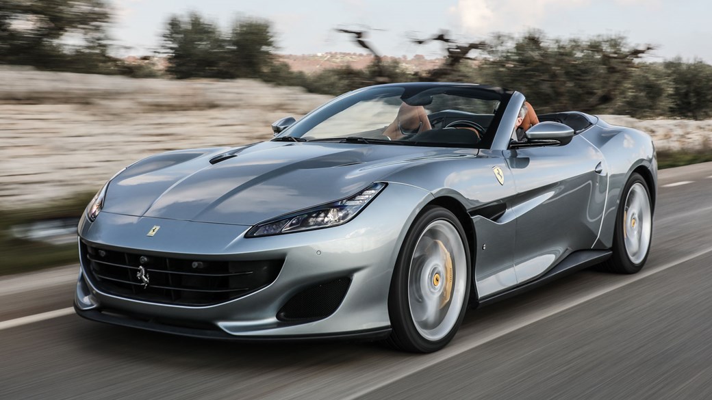 Il nostro bell’uomo protagonista, vestito con gli abiti tipici del 1950, esca da una Ferrari Portofino del 2018