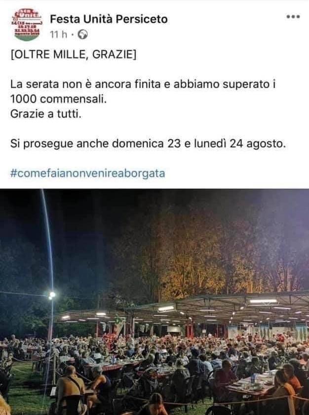 Gli organizzatori parlano di una foto pubblicata “la scorsa sera” e, avendolo scritto il 23, dobbiamo intuire che l’immagine fosse stata caricata il 22 e poi rimossa. Ancora, nel post leggiamo riferimenti a uno stand di 40 metri, e potrebbe trattarsi proprio della foto incriminata. Infine si parla di “1000 coperti” e ricordiamo che nel post attribuito alla Festa dell’Unità leggiamo: “Abbiamo superato i 1000 commensali”.