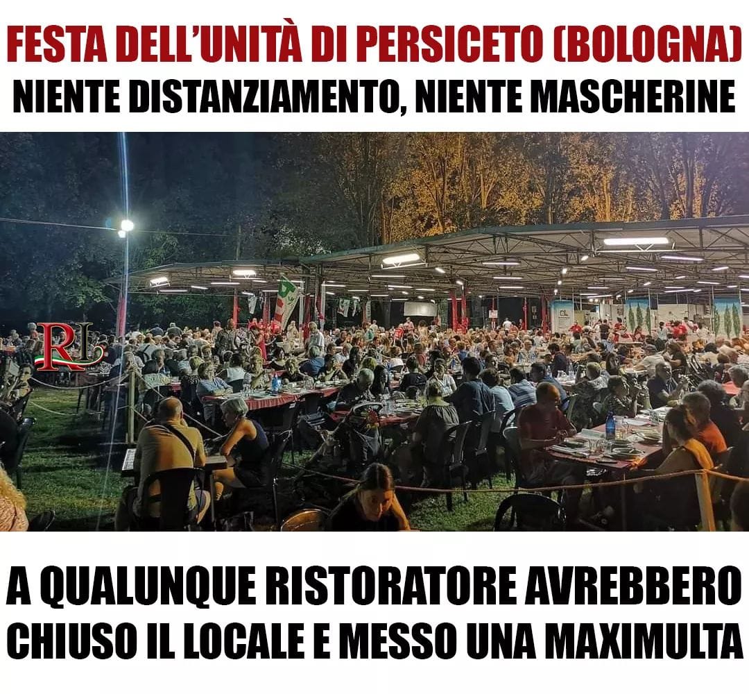 Festa dell’Unità di Persiceto (Bologna). Niente distanziamento, niente mascherine. A qualunque ristoratore avrebbero chiuso il locale e messo una maximulta.