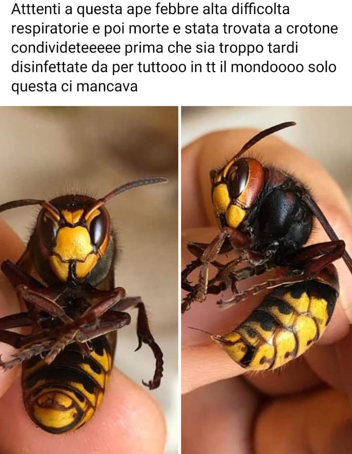 Ci segnalano i nostri contatti una condivisione riguardante una fantomatica ape che provoca febbre, difficoltà respiratorie e morte, che secondo chi condivide dovrebbe trovarsi in quel di Crotone.