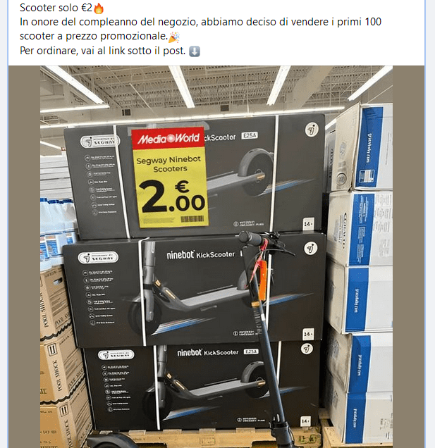 Ovvero quel genere di truffa basata sul presentarsi come un soggetto commerciale affidabile che, per motivi risibili, regala beni di valore a due euro. L’abbiamo visto con finte inserzioni LEGO, Samsonite e Amazon.