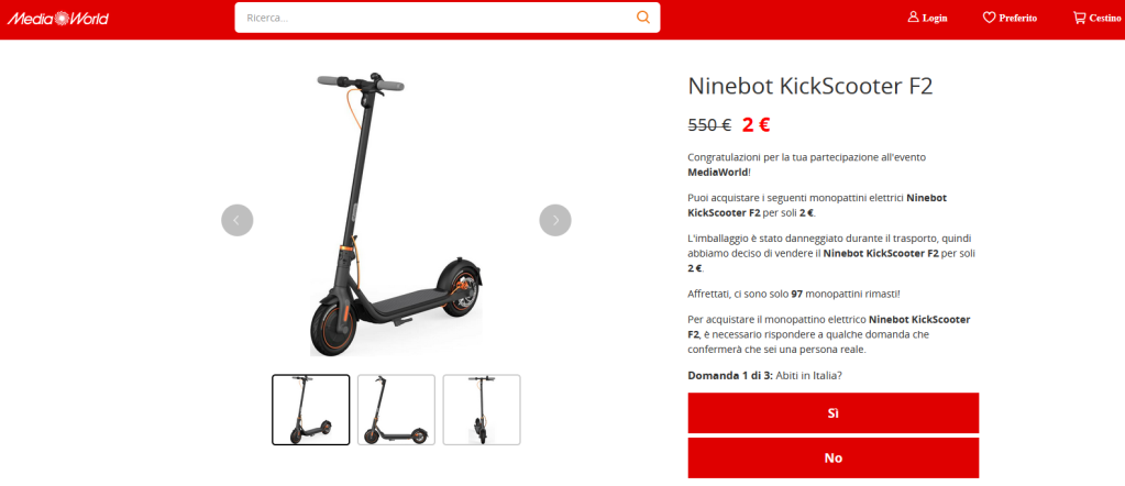 Il falso sondaggio di “media.it” per il Segway Ninebot a due euro fa parte della ricchissima famiglia del Phishing del “tutto a due euro” che abbiamo visto più volte su questi schermi.
