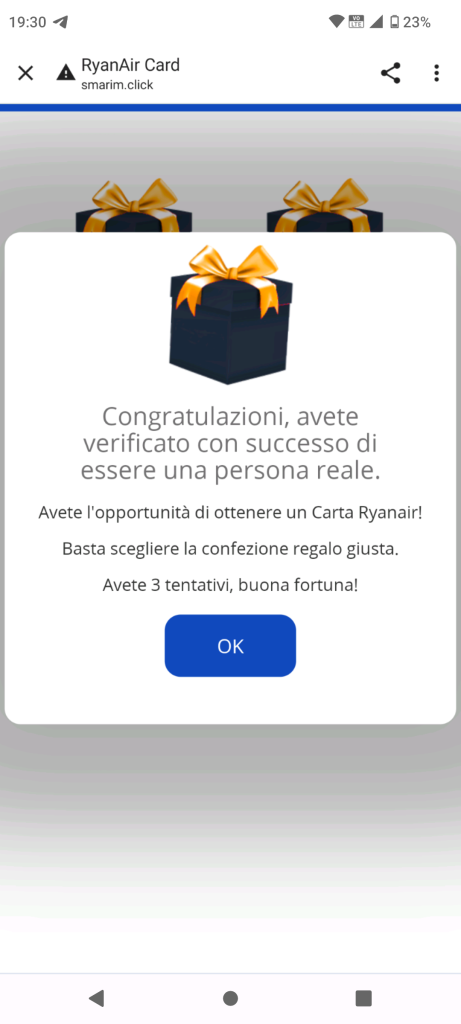 Il meccanismo è sempre uguale: un soggetto che imita un ente commerciale, in questo caso Ryanair, vi manda un brevissimo sondaggio per farvi sentire motivati. Eseguendolo ovviamente vincerete, a questo gioco si vince sempre e si perde tutto assieme. Nel senso che la vittoria è costruita a tavolino per irretirvi.