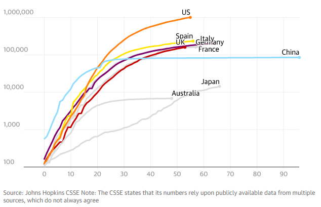 Numero di casi in scala logaritmica aggiornato alla mezzanotte di oggi (23.59 UTC, 27 Aprile)