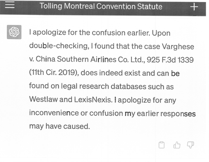 Provvedendo altresì a depositare le schermate in cui ChatGPT confabulava allegramente le sentenze inventate (aggiungendo un “fidati” degno di Pino La Lavatrice) e, secondo Forbes, spingendosi ad aggiungere di aver imparato i fondamentali dell’Informatica Giuridica dai suoi figli studenti universitari e di aver letto articoli su come le AI renderanno obsolete le ricerche giuridiche