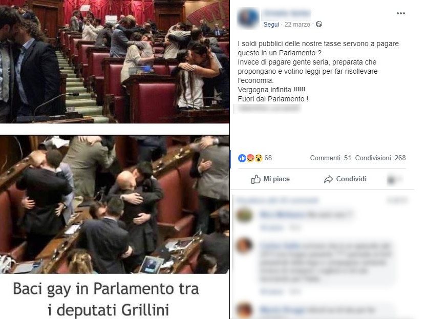 Un post pubblicato il 22 marzo 2019 su un profilo Facebook di dubbia autenticità mostra due foto che catturano un bacio omosessuale tra alcuni deputati del Movimento 5 Stelle, riportando le immagini come uno scandalo politico.