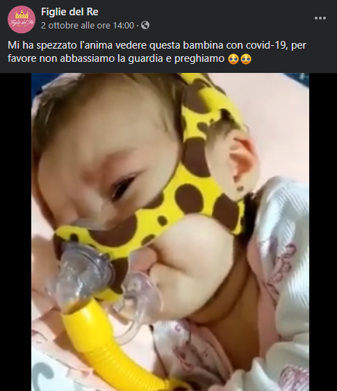 Le strazianti immagini di una presunta “bambina con COVID19” sono state condivise dalla pagina Facebook Figlie del Re, una community a tema religioso. Secondo la descrizione la bambina, con evidenti difficoltà respiratorie, avrebbe contratto il virus SARS-CoV-2 e per questo gli admin scrivono: “Non abbassiamo la guardia e preghiamo”.