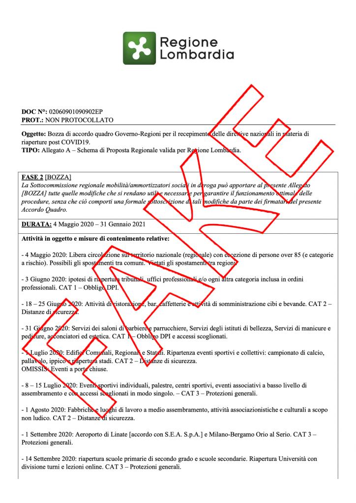 Tocca ora a questo testo, una Bozza di accordo Quadro-Governo Regioni per il recepimento delle direttive nazionali post COVID19 in Lombardia, falsa come una banconota da tre euro e mezzo, ottenuta copincollando la bufala precedente con qualche data cambiata su un logo della Regione Lombardia.