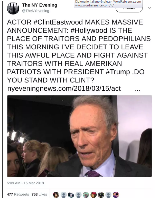 L’affermazione (presunta) di Eastwood è stata pubblicata tramite un tweet, il mese scorso, dall’account del NY Evening News. La notizia è apparsa come una ripubblicazione di una citazione dell’attore, che starebbe «lasciando Hollywood» perché piena di «traditori e pedofili».