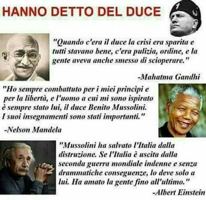 Bufala con una lunga e ben poco gloriosa storia: praticamente un centone di improbabili citazioni di Gandhi, Mandela ed Einstein, una più grottesca dell’altra, che elogiano in vari modi Benito Mussolini con trite e ritrite affermazioni demagogico-populistiche (Gandhi che invoca ordine e pulizia, Mandela che invoca il “Duce” e Einstein che loda l’amore per il popolo di Mussolini…).
