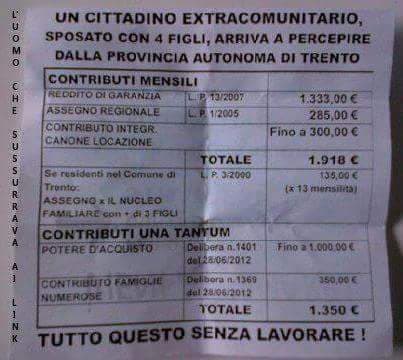 E così, se un foglietto sul web lo dice, è ovvio che, nella Provincia di Trento alle famiglie degli “extracomunitari” (rigorosamente tra virgolette per ostentare becero disprezzo) vanno quasi 2.000 euro al mese, no?