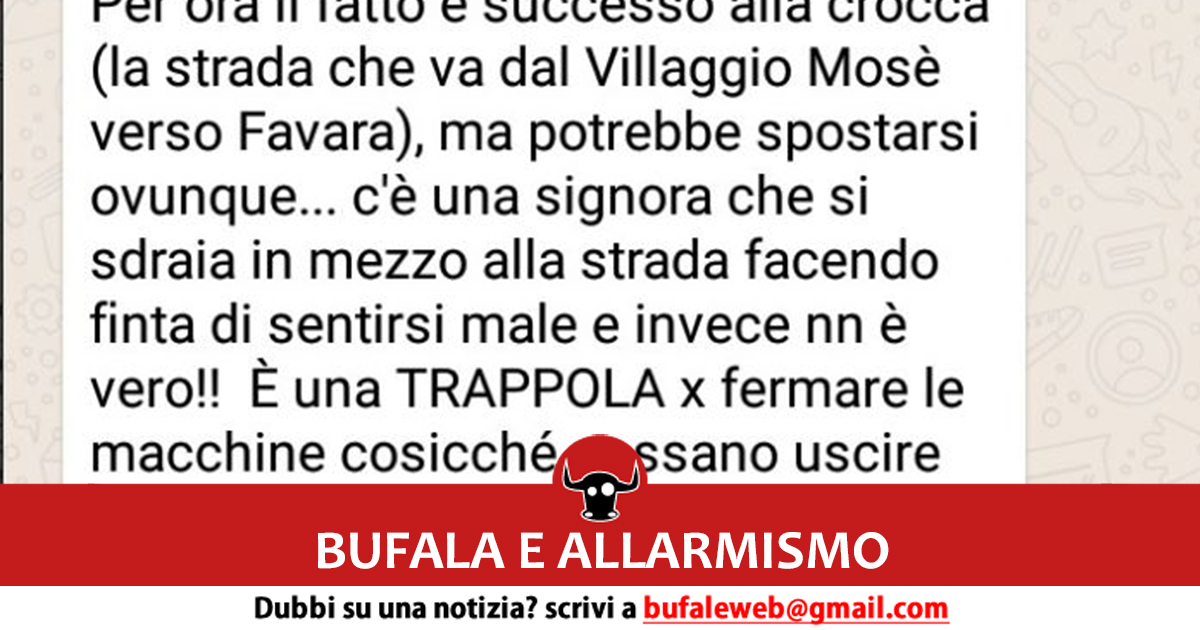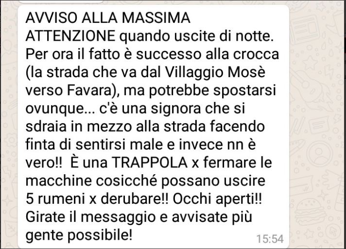 Avviso alla massima attenzione quando uscite di notte. Per ora il fatto è successo alla “Crocca” (la strada che va dal Villaggio Mosè verso Favara), ma potrebbe spostarsi ovunque… C’è una signora che si sdraia in mezzo alla strada, facendo finta di sentirsi male e invece non è assolutamente vero! E’ una trappola per fermare le macchine, cosicché possano uscire 5 persone per derubare! Occhi aperti! Girate il messaggio e avvisate più gente possibile!