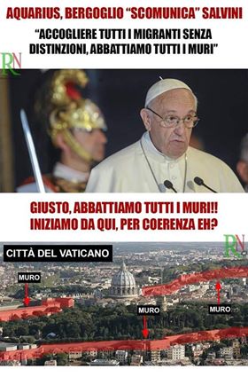Bergoglio peggio di Soros continua a propagandare la sostituzione etnica del popolo europeo: “Accogliere tutti i migranti senza distinzioni. Abbattere tutti i muri”. Ma come sempre predica bene e razzola male. Lo Stato con più muri contro gli immigrati e senzatetto è proprio il Vaticano, il pontefice iniziasse (!!!, ndr) ad abbattere i suoni di muri.