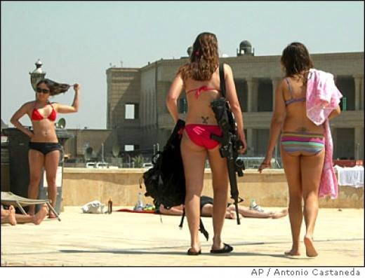 Con quel loro fucile in spalla è sempre meglio pensarci su due volte, prima di distruggere il loro castello di sabbia. Il soggetto in bikini rappresenta un soldato membro delle forze di difesa israeliane in alta qualifica. La foto, indubbiamente sorprendente, è stata scattata a Tel Aviv e pubblicata su Internet, diventando virale e scatenando lo choc di quanti vedevano un’arma ostile su una spiaggia assolata.